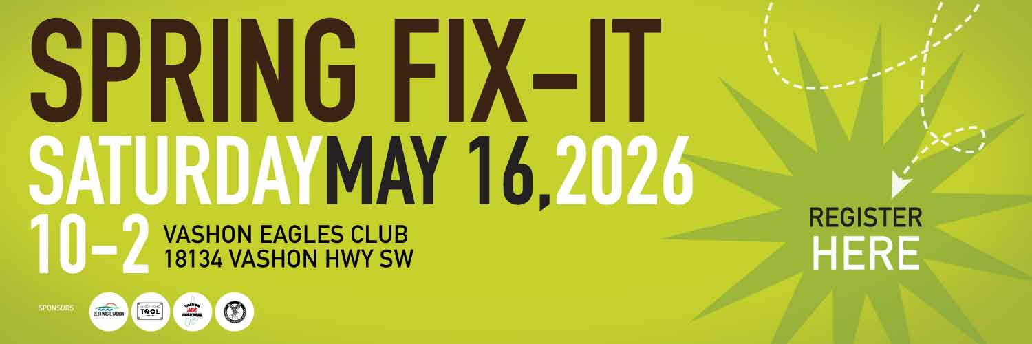 You’re in luck. The next Fix-it Cafe will be Saturday May 16, 2026 at The Eagles Clubhouse. Bring that … whatever it is … to our dedicated band of Fixers and Tinkerers. If we can, we’ll set it back on its legs and keep it out of the landfill for a while more. Sponsored by Zero Waste Vashon, Vashon Tool Library, Vashon Ace Hardware, and the Eagles.